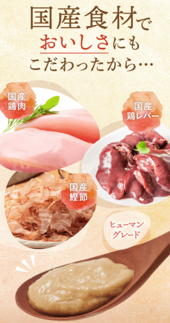 国産鶏肉、鶏レバー、かつお節などの