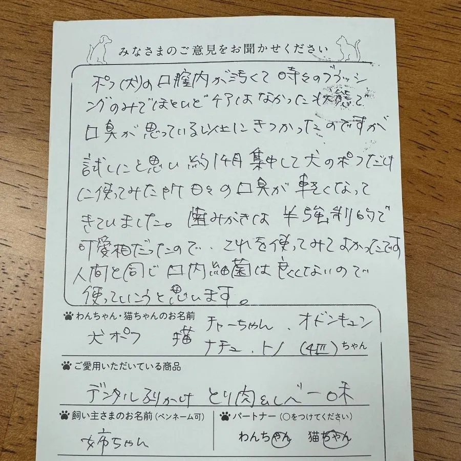 3歳になる前くらいに口臭が気になってきました。広告で見て「まさか口臭がなくなって…」と疑っていましたが、使い始めてから2カ月くらいから口臭が気にならなくなり、その後徐々に歯垢も取れてきました!