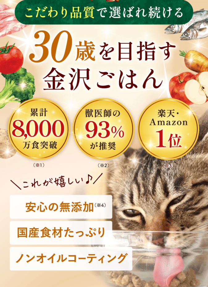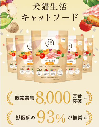 ※1 2025年8月末日までの犬猫生活ブランド累計販売数。ドッグフードは1食45g換算(成犬4kgの1日の目安量。1日2食換算)、キャットフードは1食36g換算(成猫4kgの1日の目安量。1日2食換算)、手作りごはんは1食188g換算(成犬4kgの1日の目安量。1日2食換算)、サプリメントは1食1袋換算※22021年10月 Vet'sEYE調べ※3 Amazonのキャットフード部門において、2025年1月9日(木)の新着ランキング1位。Amazonのドライキャットフード部門において、2025年1月9日(木)の新着ランキング1位。楽天市場のペット・ペットグッズ>猫用品>その他部門カテゴリーにおいて、2024年8月30日(8月31日(土)更新)のデイリーランキング1位※4保存料、香料、着色料不使用